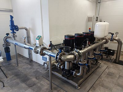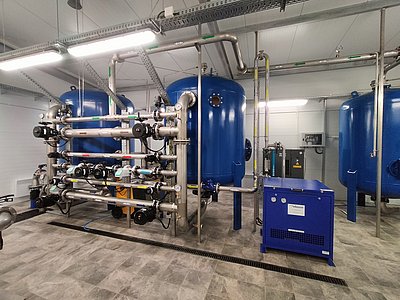 The building has been also fitted with: a water treatment system based on an aerator with a diameter of 1400 mm and two pressure filters with a diameter of 1800 mm, a compressed air system and a regeneration system equipped with an air blower and a rinse pump. The system is capable of treating 200 m3 of water per day. There is also a hydrophore set consisting of four pumps with a maximum capacity of 75 m3/h. The set draws treated water from water reservoirs and feeds the water supply system.