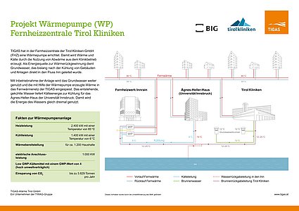 In cooperation with TIGAS, a large heat pump was installed in the district heating centre at Innrain 96. The waste heat from the clinic is used to supply up to 1,200 households with district heating. In addition, the cooling energy generated is used to cool an institute of the University of Innsbruck. This innovative solution means that the return water from the well is used multiple times, increasing overall efficiency and saving around 3,800 tonnes of CO₂ emissions annually. With a total output of 2.4 MW in heating mode and 1.4 MW in cooling mode, the heat pump in the district heating centre of the Tirol Kliniken in Innsbruck is one of the largest in Austria and represents a European flagship project for sustainable energy supply.