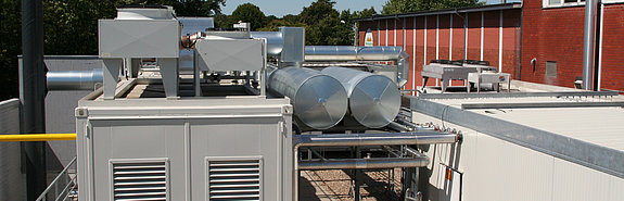 In order to reduce energy costs and increase efficiency, a plant that had been unique in the bakery industry until then was built in 2011 and 2012. The new CHP plant was built in a container on the roof of the Mestemacher GmbH factory building at the Gütersloh site. The main unit is a gas-engine cogeneration plant powered by natural gas with a firing thermal output of 2.05 MW. The exhaust gas flow from the gas engine is used to provide thermal power in the form of thermal oil and steam for the Mestemacher GmbH production process by means of a thermal oil heat exchanger and a downstream waste heat steam generator. The engine cooling heat of the gas engine is used at a low temperature level for heating purposes and cold generation by means of a cold absorption machine.