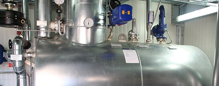 The generated steam is fed to the existing steam collection line and further routed to the heat consumers. When steam consumption is low, the generated steam is stored in a steam accumulator designed for this purpose at a pressure level of 8 bar(a) and then released into the production process at 2 bar(a) during peak load periods. This leads to a continuous utilisation of the gas engine unit. The amount of steam produced is supplemented by steam from the existing and renewed steam generators in such a way that a complete and redundant steam supply is guaranteed at all times.