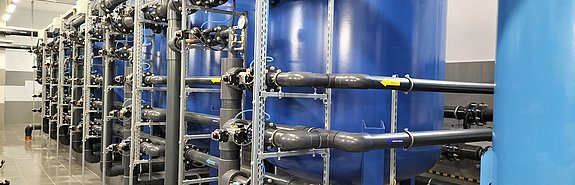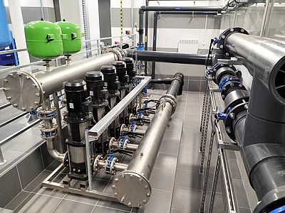 Water treatment technology based on a two-stage filtration system was installed in the building. The first stage comprises a central aerator with a diameter of 1600 mm and five DN1800 high-rate pressure filters, while the second stage comprises a central aerator with a diameter of 1600 mm and four DN1800 high-rate pressure filters. The water treatment technology is also equipped with a compressed air system and a bed regeneration system equipped with an air blower and a flushing pump. The process system implemented in this way allows for the treatment of 95 m3 of water per hour. A pressure-boosting plant consisting of five pumps (4+1) was installed in the building. The plant draws treated water from retention reservoirs and feeds the municipal water-supply receiving system at a rate of 160 m3/h, while maintaining a water pressure of 5.6 bar. Owing to the installation of a 107 kVA power generator at the facility, the facility can produce and distribute water even during power cuts.